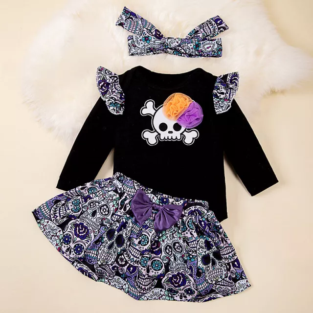Give your baby girl a memorable Halloween with this charming and comfortable costume. With its playful skull design, sweet bow headband, and puff sleeve bodysuit, your little one will be ready to steal the spotlight. Make her first Halloween an unforgettable one—order now and watch her light up the night!