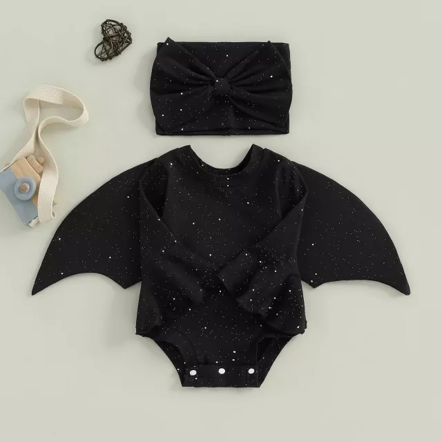 • Complete Halloween Outfit – Comes with a glitter batwing romper and matching bow headband.